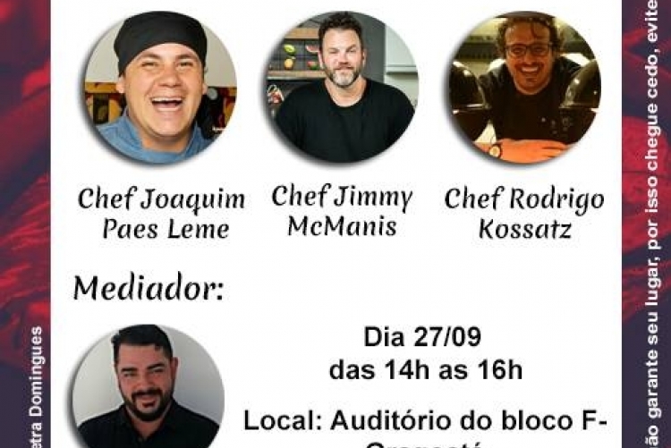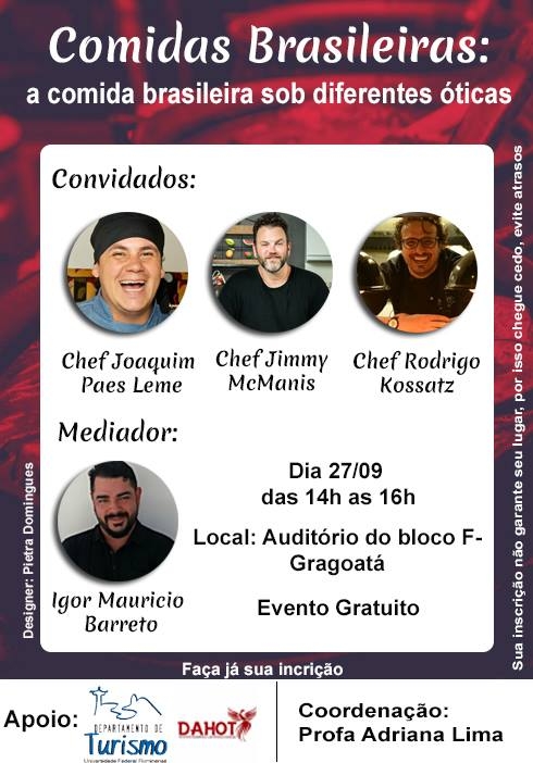 O projeto de extensão “A cozinha brasileira e suas raízes” possui quatro etapas. A terceira será realizada no dia 27/09/2016 e contará com um simpósio denominado “A comida brasileira sob a ótica de quem faz". Três renomados chefs vão discutir a culinária brasileira e regional do Rio de Janeiro: Jimmy Mcnannis (do Programa “Mais Você” da rede Globo) que abordará o tema “Comida de Rua“; Rodrigo Kossatz, com o tema “Culinária contemporânea dos restaurantes do Rio de Janeiro”, e Joaquim Paes Leme, com o tema “Culinária Brasileira e de Boteco nas Pequenas Indústrias”.